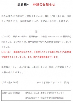 【重要】1月16日(土) 臨時休診のお知らせ(おおよど眼科クリニック) (2021年01月15日)