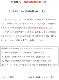 【重要】患者様へ診療再開のお知らせ(おおよど眼科クリニック)(2021年01月16日)