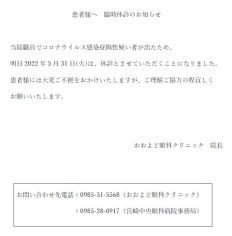 【重要】おおよど眼科クリニック 臨時休診のお知らせ(2022年05月30日)