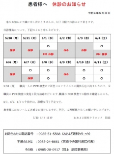 【重要】おおよど眼科クリニック 休診のお知らせ(2022年05月31日)