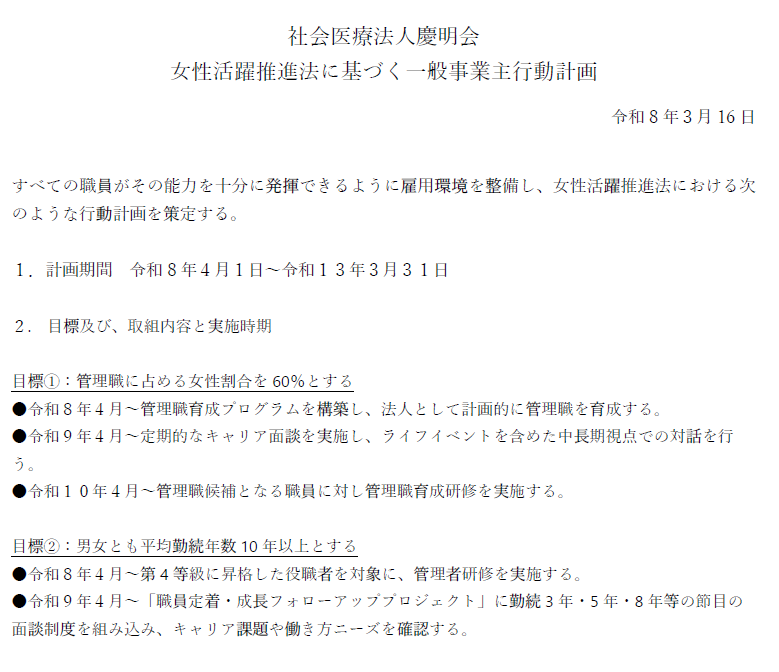 社会医療法人慶明会 女性活躍推進法に基づく一般事業主行動計画
